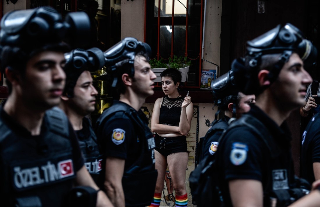 This photo shows a young woman in rainbow stockings standing in the street while the riot police march past. The Istanbul Gay Pride march, which had been planned for Sunday June 26, 2016, was banned because of ‘security concerns’. Protesters turned up despite the ban and spread out in small groups, being visible in this way rather than in a march. Police dispersed protesters using tear gas and rubber bullets.