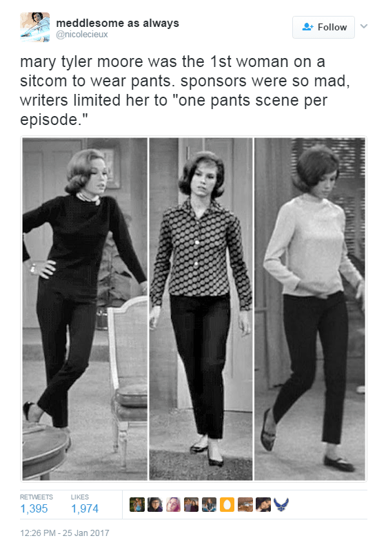 They rebroadcast a few old interviews with Mary Tyler Moore, and in them she addressed the pants issue. There was a strict limit on what kind of pants she could wear (hence, always Capri pants, nothing masculine), and to use her words, how much cupping the pants could show. A censor would look at every outfit when she came out on stage, and if the pants cupped her buttocks too much, defining them rather than hiding them, then she had to get another pair.
