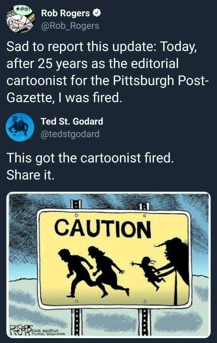 “This is precisely the time,” Pittsburgh mayor Bill Peduto (often the target of Rogers’ cartoons) said, “when the constitutionally protected free press – including critics like Rob Rogers – should be celebrated and supported, and not fired for doing their jobs. This decision, just one day after Trump labeledthe news media is ‘our country’s biggest enemy.’“