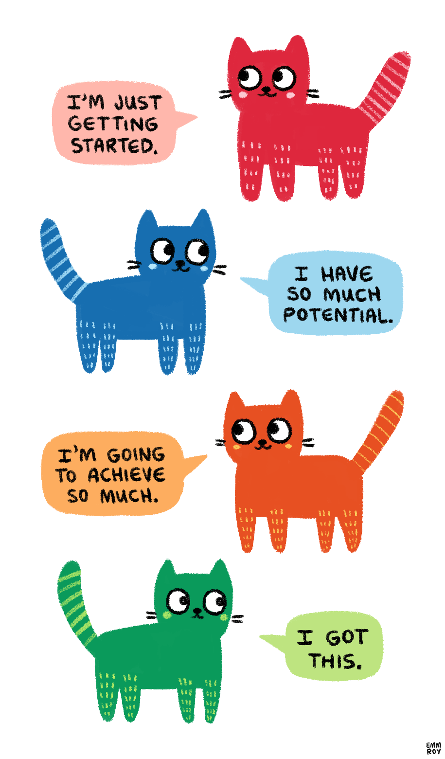 [doodle of four cats: a red cat saying “I’m just getting started.”, a blue cat saying “I have so much potential.”, an orange cat saying “I’m going to achieve so much.”, and a green cat saying “I got this.”]