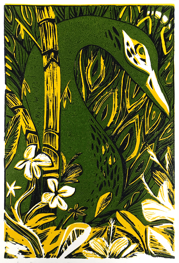 Done in three layers off a single 6″x9″ rubber stamp (carving, printing, then carving off more- essentially destroying the previous layers for each subsequent printed layer)
